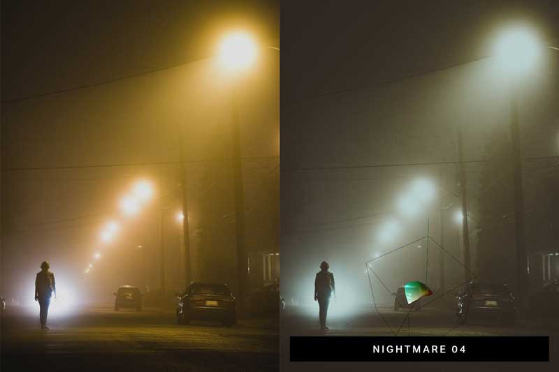 - Nightmare (10 Presets) – Contrasty tones with crushed shadows and eerie filmic colors.