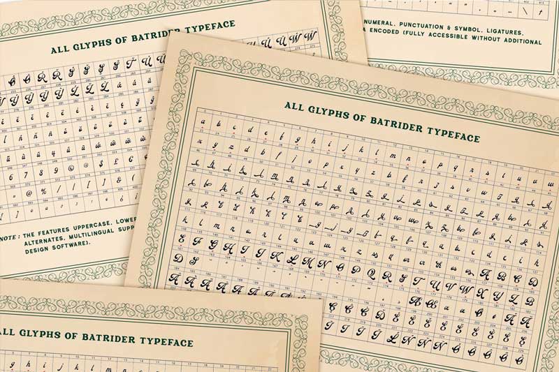 Batrider inspired by vintage lettering in the old label. This comes with two styles: regular and textured typefaces. Batrider textured consists of the rounded corner and authentic textured for organic printing look. Carefully made with perfectly horizontal vertical bezier handles. Every single letter contains beautiful alternates characters (ss01 – ss16) and feature ligatures.