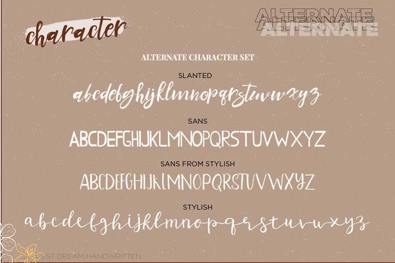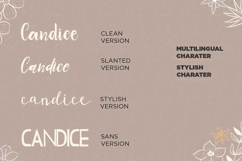 Candice Trio Fonts is a fresh handwritten Script font brush, elegant feel character set. The Candice font includes a full set capital and lowercase letters, as well as multi-lingual support, currency figures, numerals, & punctuation and swash.