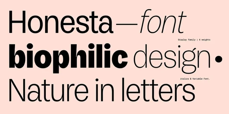 Honesta—Spanish for honest—is a display grotesque typeface infused with an engaging human touch. The nuances found in the exaggerated contrast from stem to curve and the slightly angular terminals give what could be seen as ordinary a stylish appeal. It balances natural expression and digital clarity perfectly, offering a refreshed, modern sans for typographic designers wanting a little bit of the unexpected. Honesta is a 12-style family, including true italics and variable fonts.