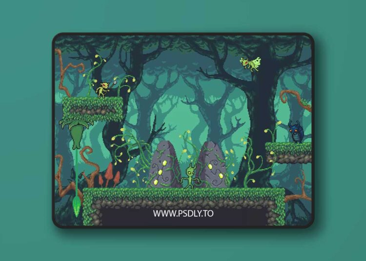 - Three different backgrounds for the setting of the areas, each one with several layers that can be combined with each other to create infinite parallax effects.