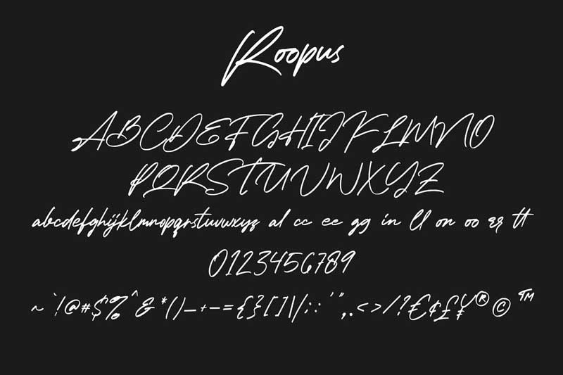 Give your designs an authentic handcrafted feel. “Roopus” is perfectly suited to signature, stationery, logo, typography quotes, magazine or book cover, website header, clothing, branding, packaging design and more.