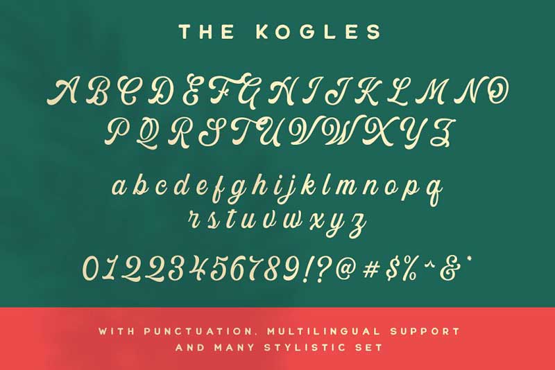 Please welcome our newest script typeface, The Kogles, a nice script typeface with a retro feel. This font perfectly made to be applied especially in logo, and the other various formal forms such as invitations, labels, logos, magazines, books, greeting/wedding cards, packaging, fashion, makeup, stationery, novels, labels or any type of advertising purpose.