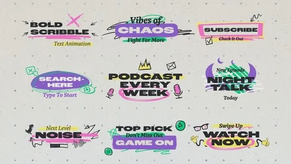 Bring energy and personality to your videos with this pack of 9 bold titles. Each design features playful scribble and hand-drawn marker accents, perfect for podcasts, social media, event promos, and lifestyle content. With colorful textures and unique animations, these titles stand out in any creative project.